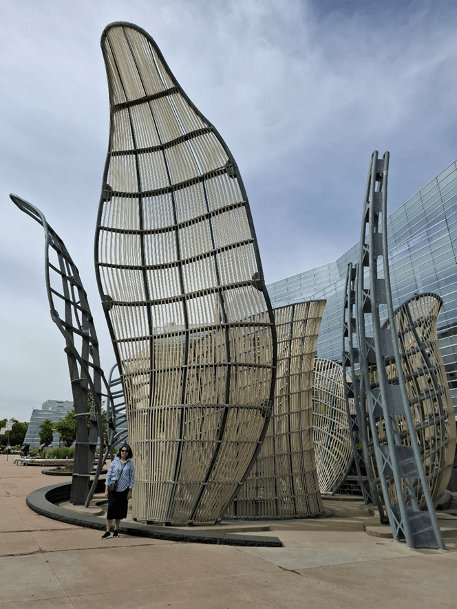 É justamente o fato de o museu estar integrado ao espaço público que me fez dar nome a este capítulo de meu diário de viagem. É adorável ir andando pela rua e ver que o museu vai além dos edifícios e está presente no espaço público também, com esculturas que estão dispostas em frente ao lindo prédio e logo adiante na praça-parque que o integra a outras edificações, algumas públicas e uma delas de apartamentos de classe média.