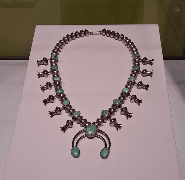 O colar de prata e turquesa pertence à nação navaja e a pesquisa indica que deve ter sido feito no decorrer do século XIX. O artista é anônimo.