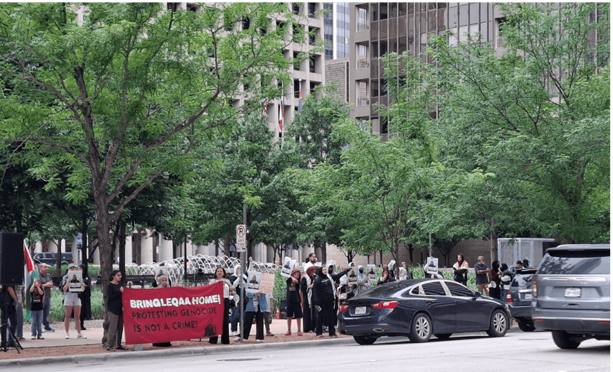 Dedicamos grande parte do dia para passear pelo centro. Assim que estacionamos nosso carro num parking, começamos a escutar vozes em protesto, por meio de um som altíssimo que nos dava a impressão de serem centenas de pessoas. Fomos nos dirigindo ao local: eram no máximo duas dezenas de pessoas, uma mulher que no microfone cantava as palavras de ordem e os demais que repetiam. Eram palestinos, protestavam contra Trump e a Suprema Corte, pelas medidas que levaram a deportação de estrangeiros. Especialmente, gritavam pela volta de uma mulher cujas fotos traziam em cartazes. Três horas depois ao passarmos novamente por perto do local, ainda permaneciam lá e a voz da mulher já estava completamente rouca.