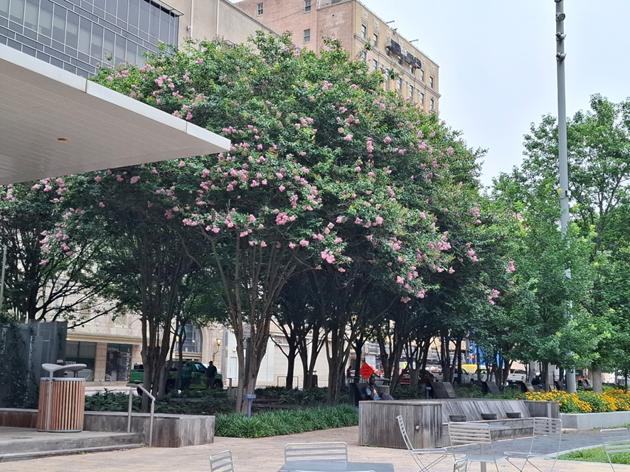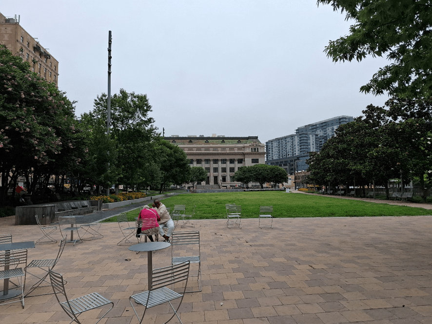 O passeio pelo centro de Dallas foi muito agradável, por causa das calçadas largas, das ruas sem excesso de trânsito e dos espaços públicos – pequenas praças e cantinhos onde há cadeiras e mesas para se ficar por um tempo.