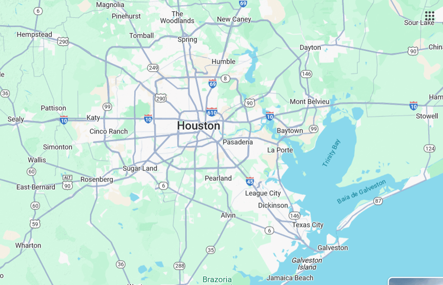 Para entrar em Houston, ficamos totalmente dependentes do sistema GPS, tal é o número de opções de saídas e de viadutos para se aceder aqui ou acolá.  No mapa que se segue, estão apenas as vias de altíssima velocidade e para se entrar ou sair de cada uma delas há sempre um complexo sistema de viadutos.