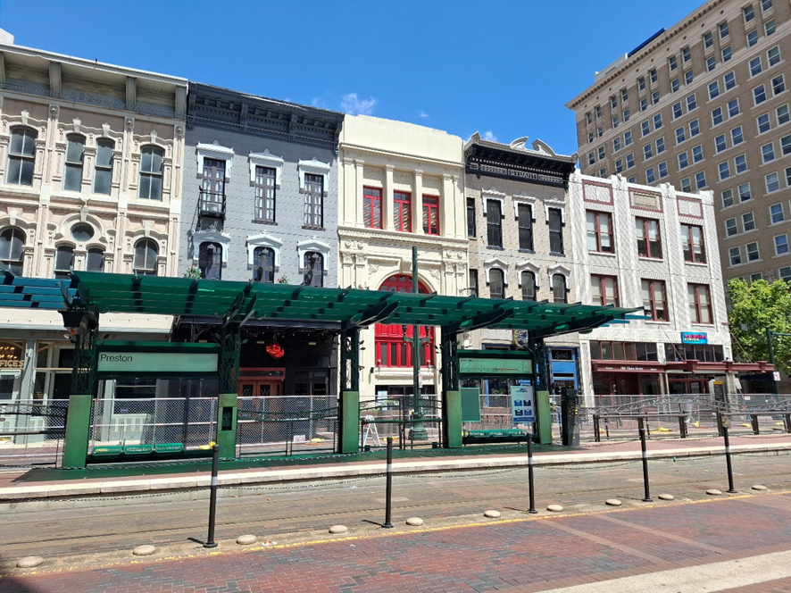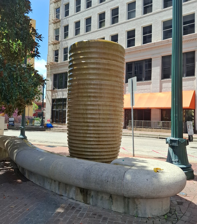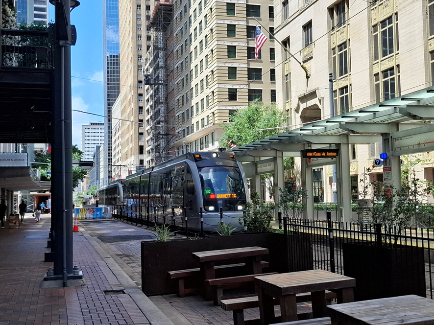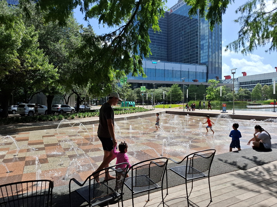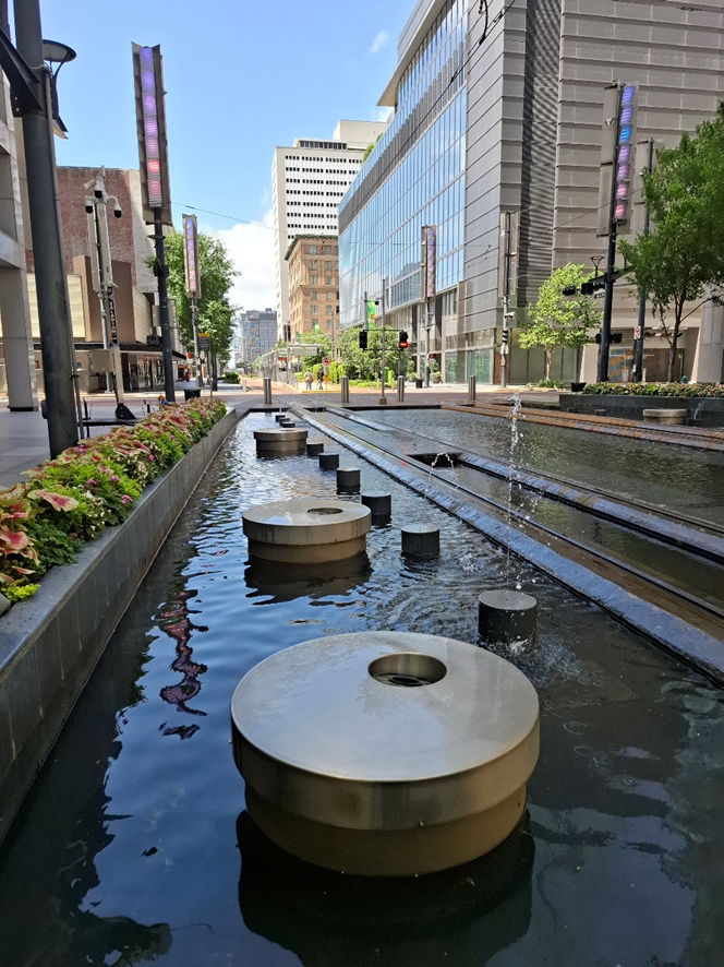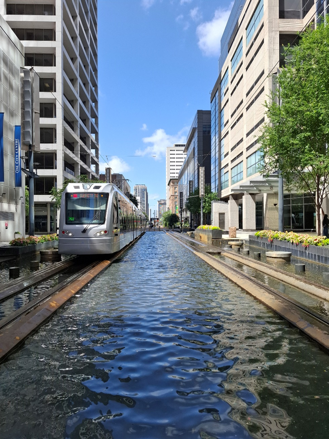 Adorei o transporte urbano por trilhos, que não é tipo metrô subterrâneo, mas está na superfície, com os trilhos convivendo com a cidade. Passando pela Main Street, em alguns trechos, ele é ladeado por um canal com água. Aliás, em todo centro de Houston há alguma “oferta” desse líquido precioso, o que é importante em se tratando de uma cidade super quente no verão. A água está sob a forma de pequenas fontes, ou como esculturas urbanas sobre as quais um pouco de água escorre continuamente. É interessante porque passa uma sensação de frescor.