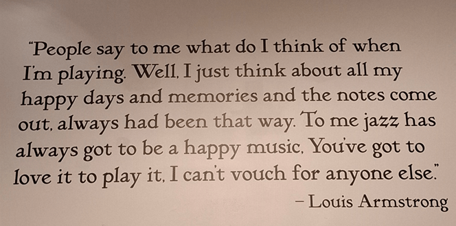 A grande estrela do museu é Louis Armstrong, que viveu até o começo da década de 1920 em New Orleans, onde tocava pelas ruas. Foi depois para Chicago que, aliás, é outra cidade estadunidense onde o jazz é super apreciado. Numa das paredes do museu está uma fala dele que é bem representativa do que era o jazz para ele.