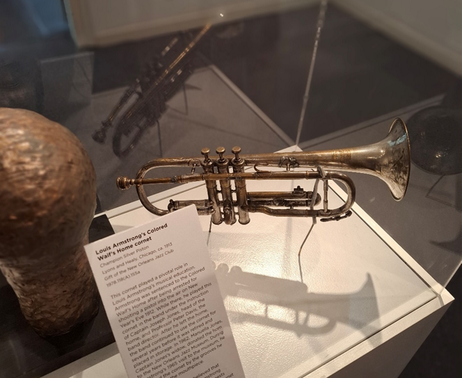 Seu primeiro trompete, com o qual vivia cantando pelas ruas de New Orleans, está neste museu.