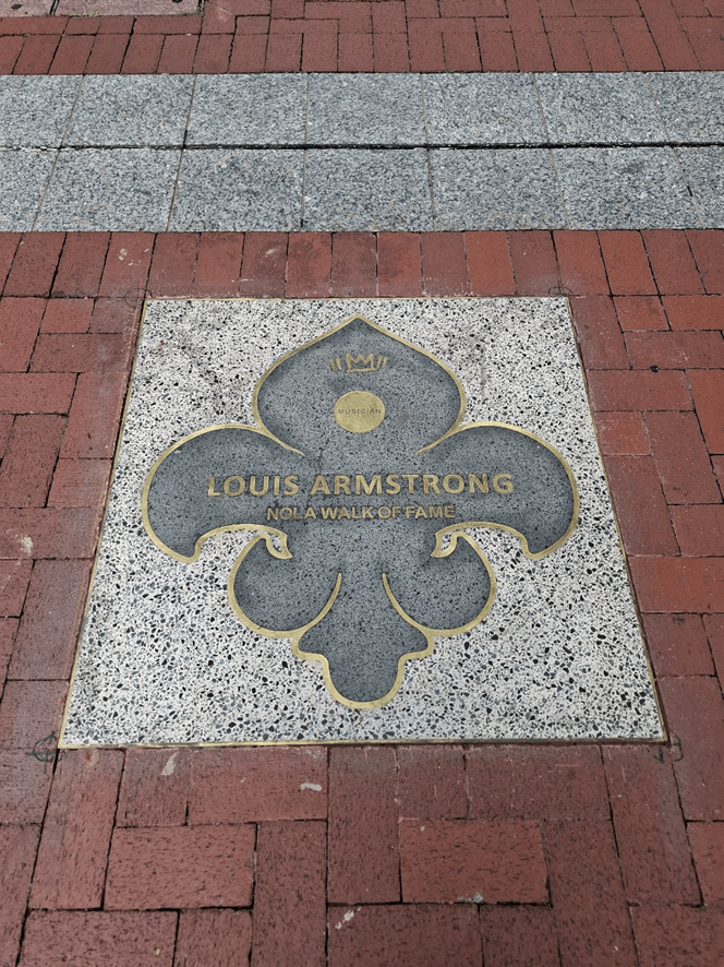 Saindo do museu, com a alma cheia e o coração quente, pegamos um bonde para ir ao CDB de New Orleans e voltamos a pé para o French Quartier. Aprendi neste trajeto que o apelido da cidade é Nola. Do nada, olho para o chão e vejo que há, em Nola, uma calçada da fama e vejam quem, com toda razão, estava lá.