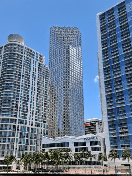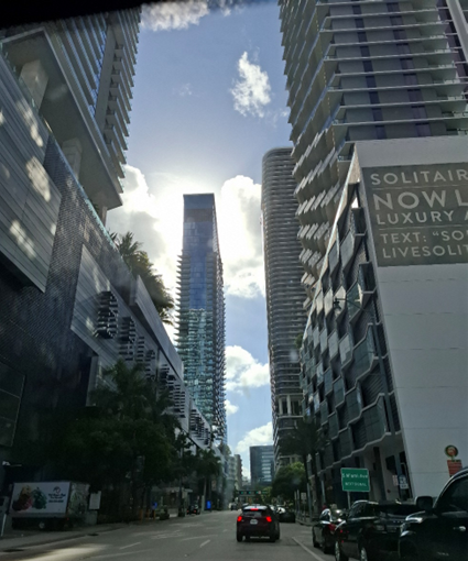 O centro principal de Miami é parecido a tantos outros que vimos nos EUA, com edificações elevadas, prédios icônicos, calçadas largas e espaços públicos agradáveis. No entanto, observei uma diferença que precisaria ser confirmada por informações mais precisas: enquanto nas demais cidades de grande porte que visitamos – Denver, Dallas e Houston – a maior parte dos prédios, na área central, é voltada aos negócios, em Miami, pareceu-me que há mais moradia, o que teria a ver com sua situação litorânea e, também, com esse grande número de moradores que vieram de outros países ou de outros estados da federação para viver ali. Vejam que alguns prédios têm fachada tipicamente corporativa, mas outros têm varandas que, pelo mobiliário que as ocupa, denotam moradias.
