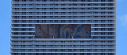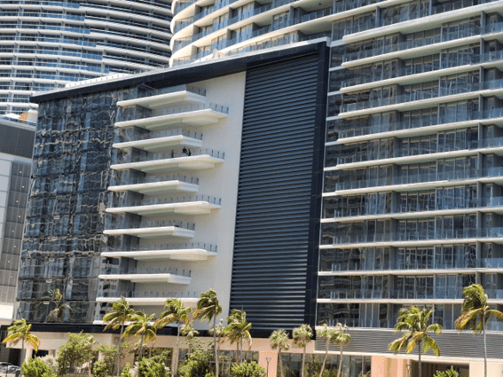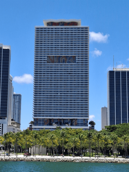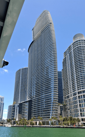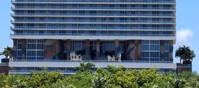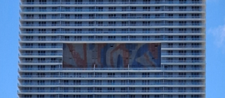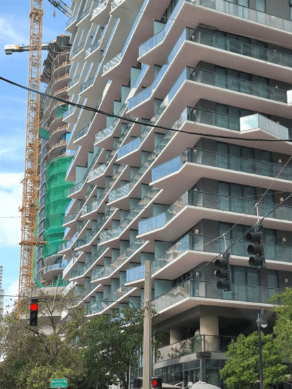 Reparem no detalhe das varandas deste prédio que está em fase de acabamento. Ele tem o formato elíptico para suportar os ventos fortes que batem em Miami em parte do ano.
