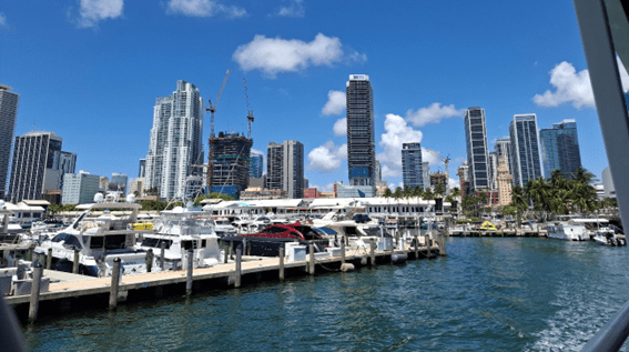A partir do mar, de onde a observamos no passeio de barco, Miami fica ainda mais bonita, com suas marinas e seu porto que, atualmente, já tem terminais de quatro grandes empresas internacionais de transatlânticos. Pelo que o guia explicou, cerca de 80 mil turistas, que viajam por esse modal, transitam diariamente por Miami.
