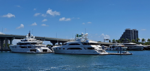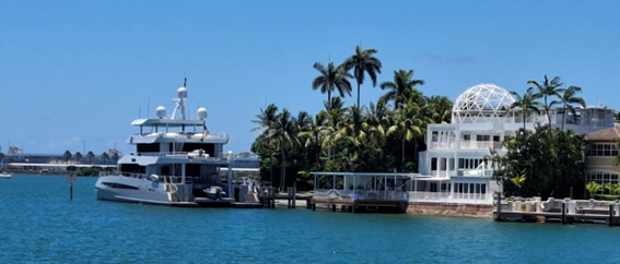 Os iates são inúmeros e há tanto os que estão navegando como os ancorados em marinas e nas residências das Venezian Islands (escrevi sobre essas ilhas em outro capítulo deste diário de viagem – https://carminhabeltrao.com/2025/06/17/miami-beach-tem-um-que-de-extravagante/)